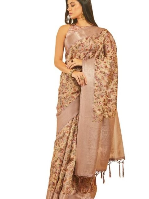Ruprekha Fashion Women’s Beige Colour Pure Tussar Silk Hand Embroidered Floral Motif Kantha Stitch Saree From Bengal