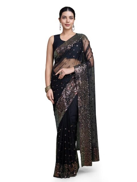 Monjolika Fashion Women’s Soft Net Saree with Sequin Embellished Border and Pallu With Unstitched Blouse Piece (Black)