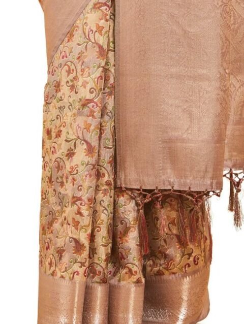 Ruprekha Fashion Women’s Beige Colour Pure Tussar Silk Hand Embroidered Floral Motif Kantha Stitch Saree From Bengal