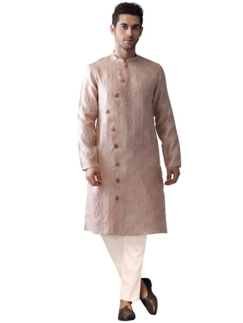 KISAH Men’s Cotton Blend Long Sleeves Regular Fit Solid Pink Kurta Trousers Set (S)