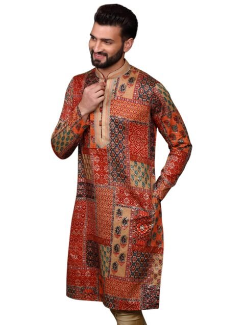 KISAH Men Red Kurta, Cotton, Full Sleaves, Knee Length, Straight, Regular Fit, Mandarin Collar Ethnic wear, 42
