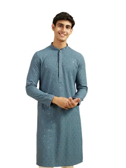 DIWAS BY MANYAVAR Men’s Viscose Embroidery|Sequin Work Kurta (Greyish Blue,S)
