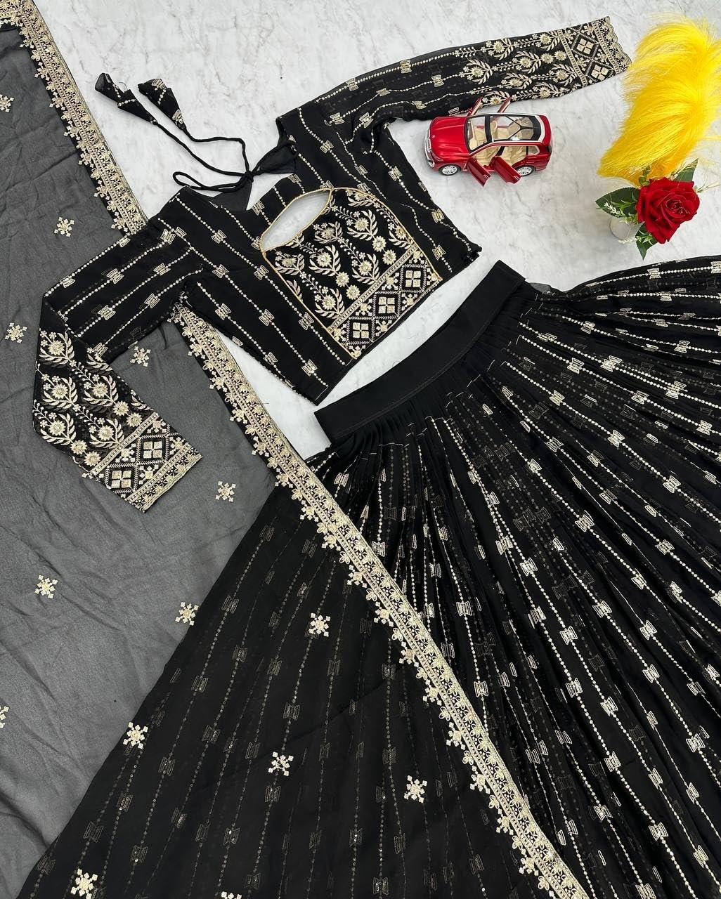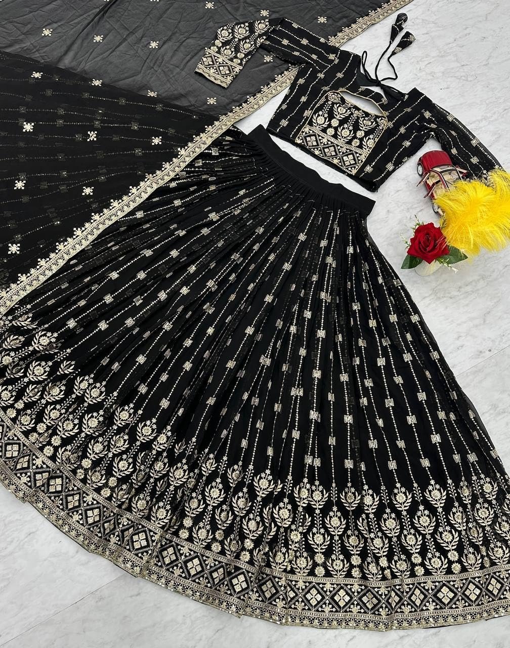 • Lehenga Measurements :- 🔹 Flair :- 3” Meter || 🔹 Length :- 42” inches || 🔹 Waist :- 44′ inches