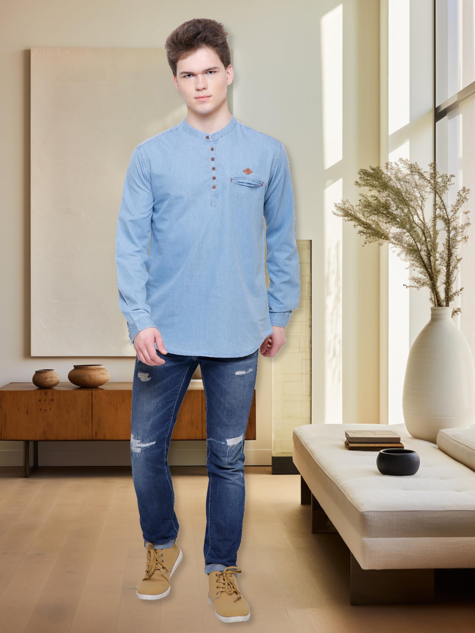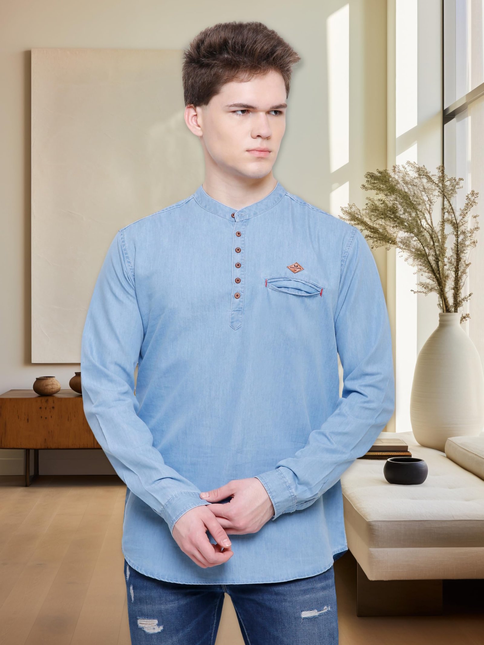 Upgrade your Wardrobe With this Denim Cotton Short Kurta by Kuons Avenue. This Shirt Style Kurta is Crafted from the Premium Denim Cotton Fabric featuring the Chinese Collar with Banded | Mandarin Neck Style with Tailored Fit, Single Welt Pocket on the Chest and Half Button Placket embellished with Wooden Buttons and a Metallic Brand Logo. This Kurta Shirt for Men has a Sleek Single Cuffed Long Sleeves with a Wooden Button Closure. Embrace the charm and grace with this Pre-Enzyme Washed Super Soft Cotton Denim Kurta with Short / Mid-Thigh Length Kurta which will make you feel comfortable to wear all day long when going on a Special Date or just for a casual occasion.