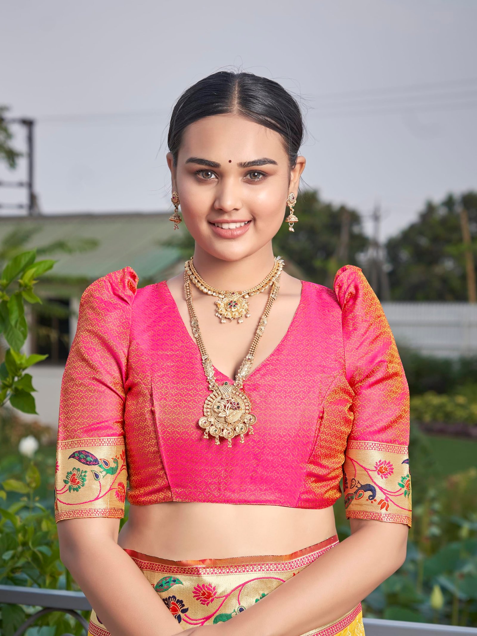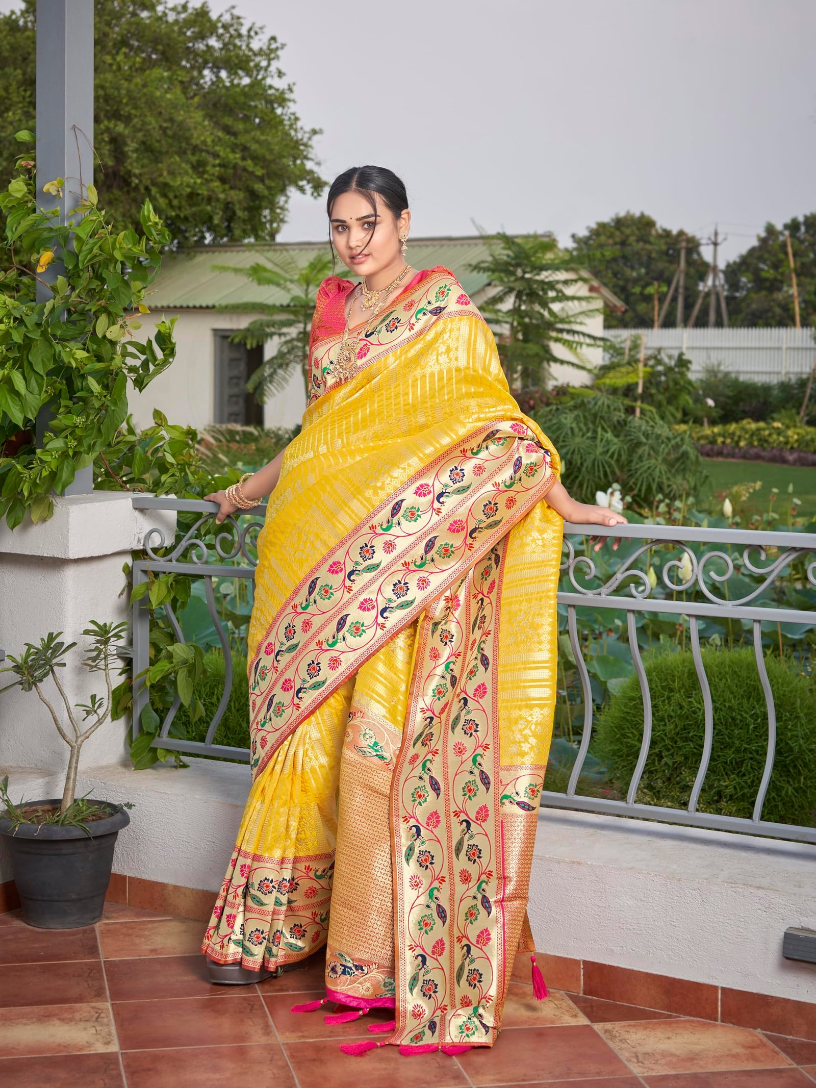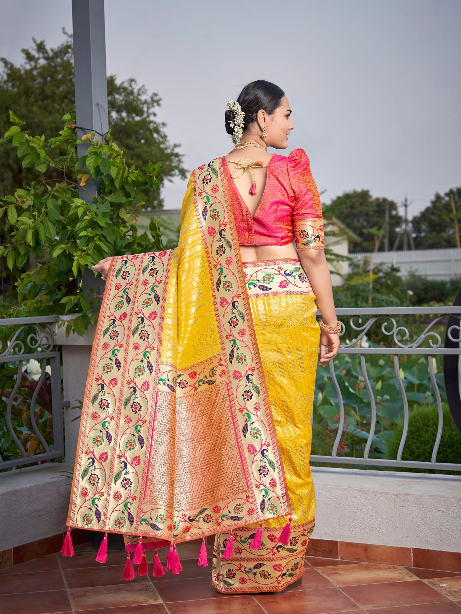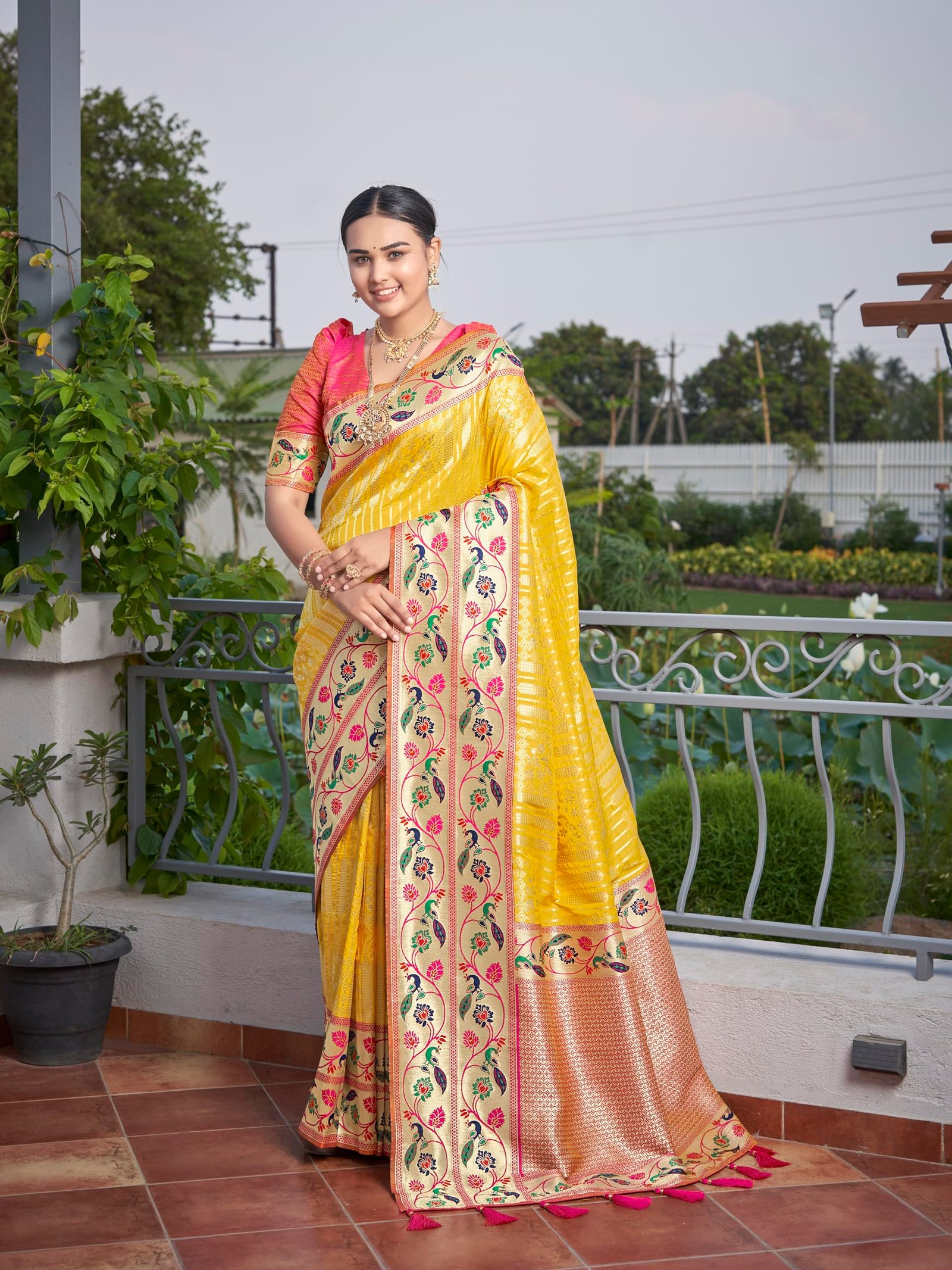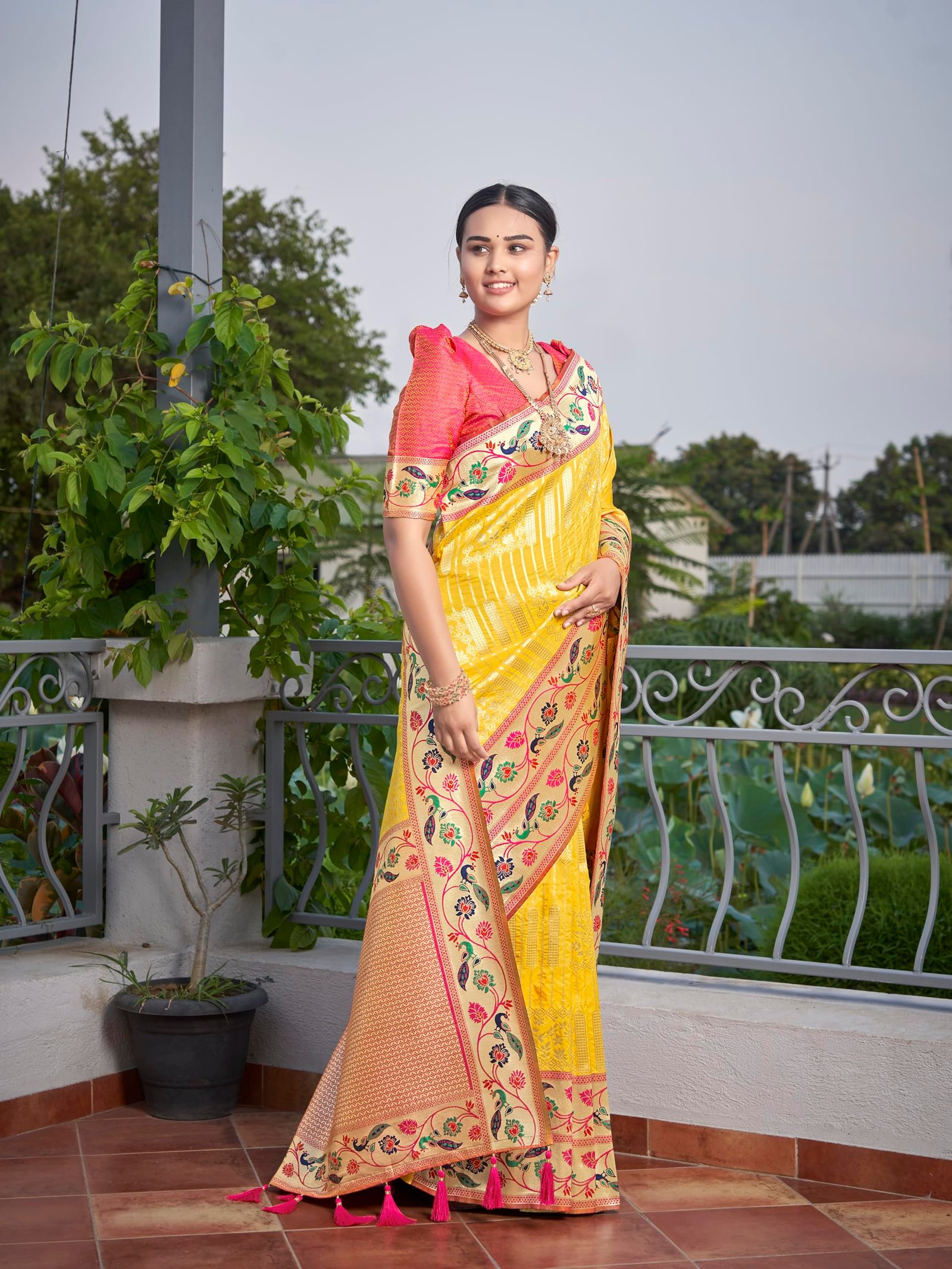 - Saree Color:Yellow, Blouse Color:Pink