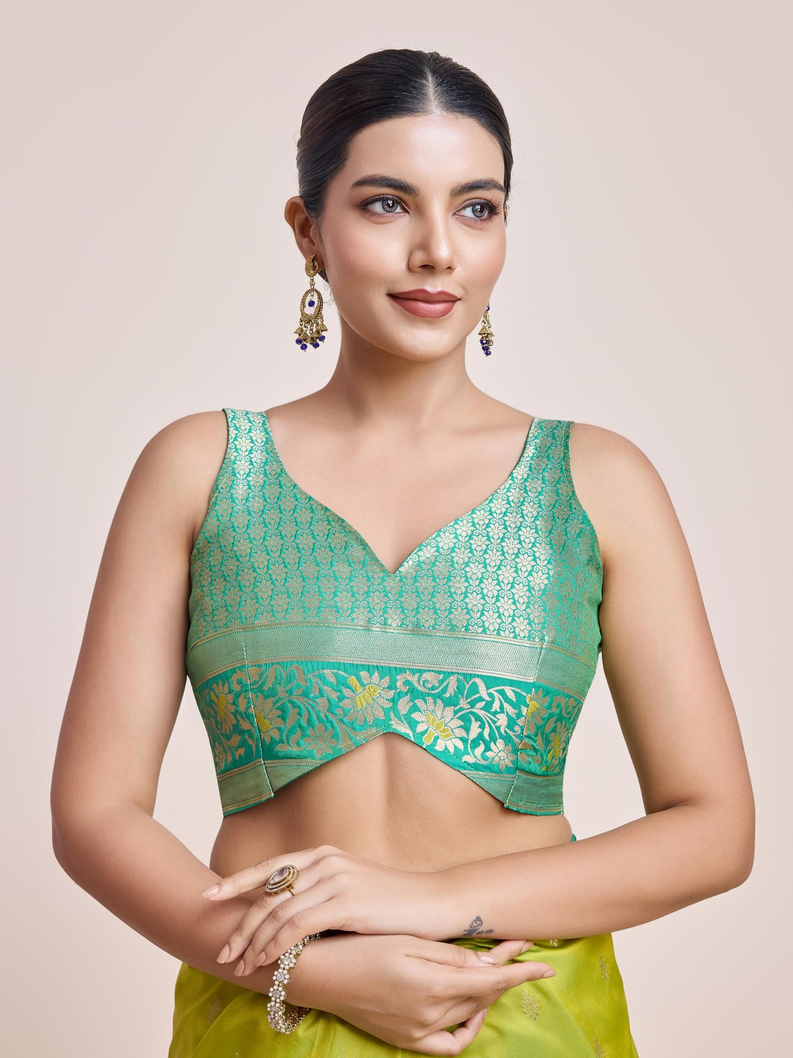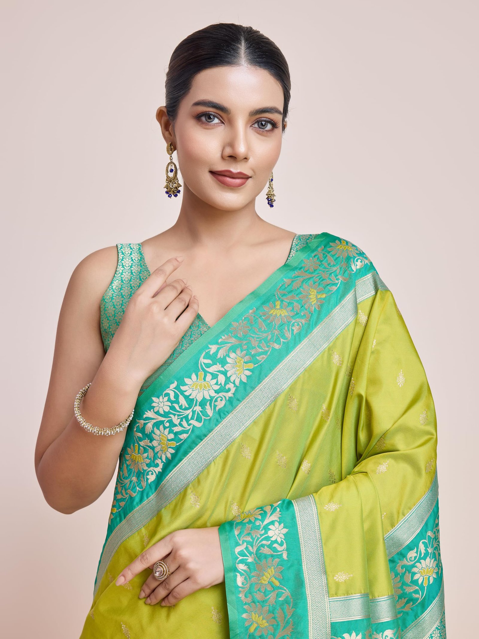 - Product Highlights : Fabric: Banarasi Satin Silk (Saree & Blouse) || Work: Zari Woven Work (Saree), Zari Woven (Blouse) || Colour: Saree –Parrot Green | Blouse – Green || Lightweight yet traditional banarasi saree for your perfect occasion look.
