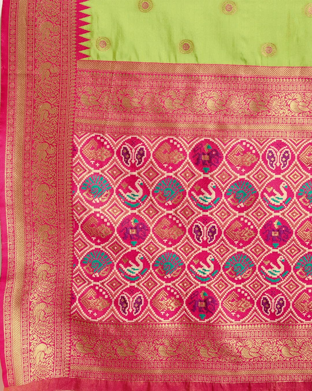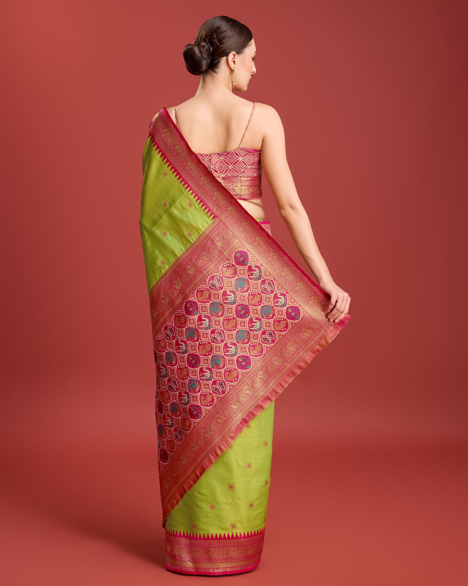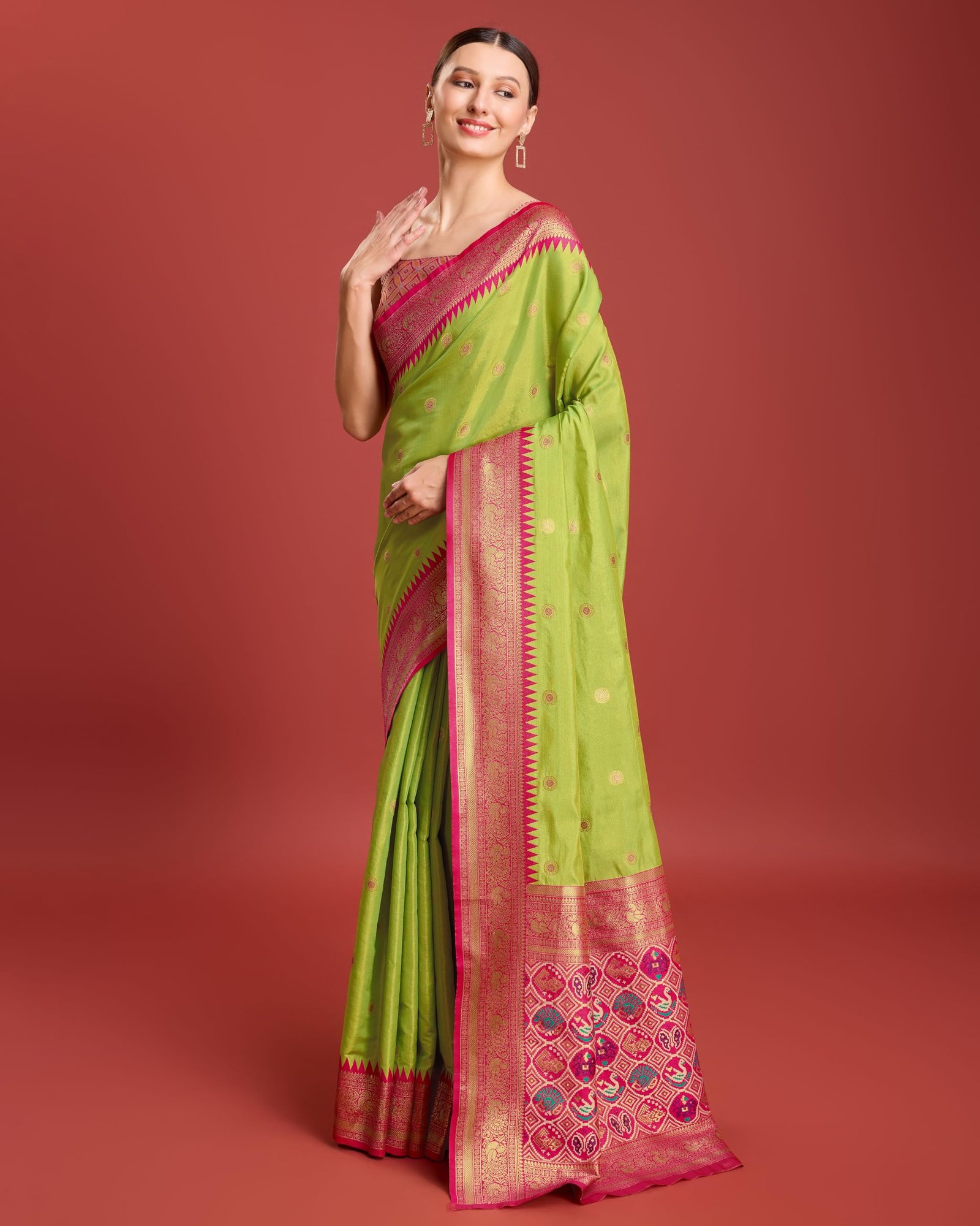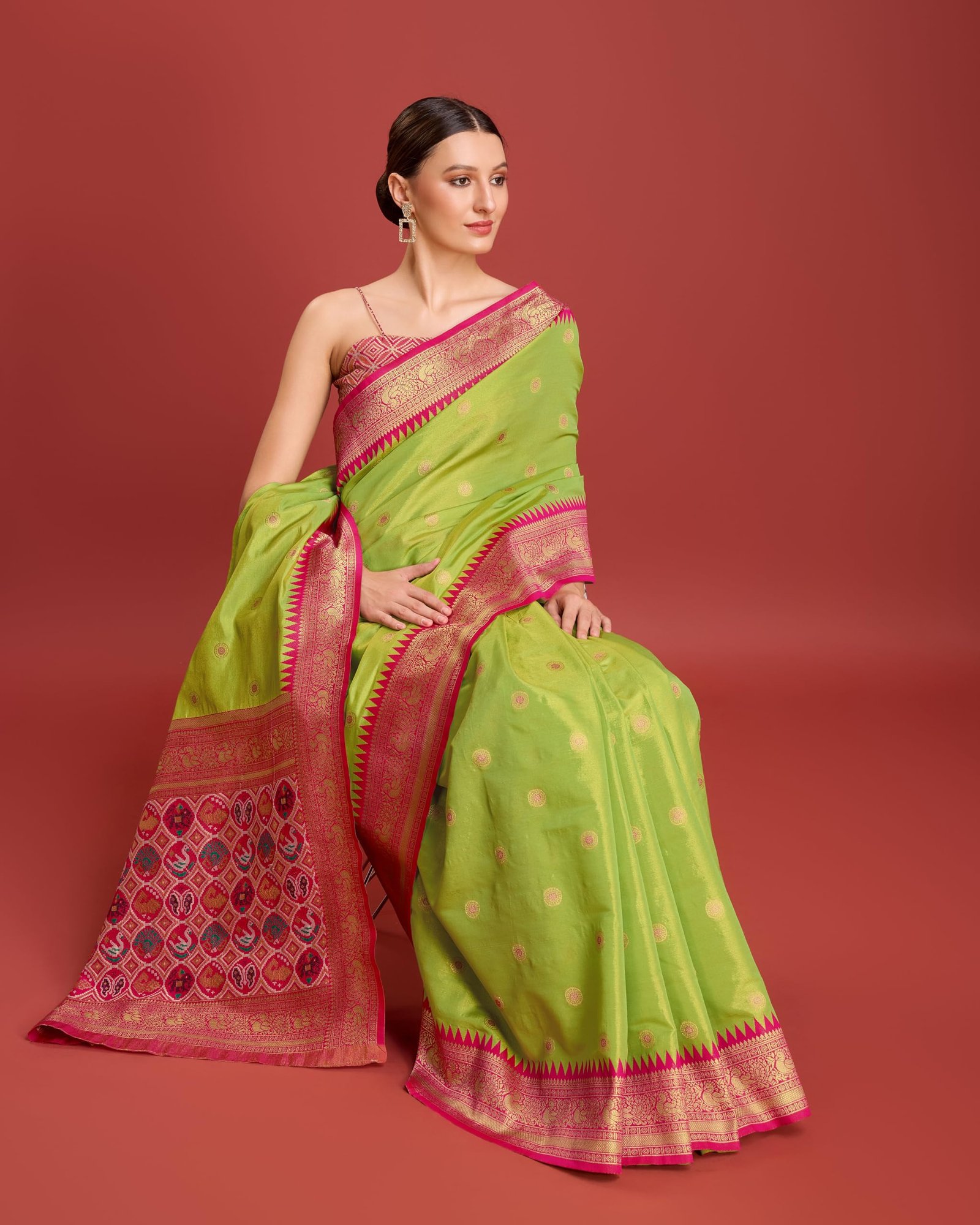 Monjolika Fashion Women’s Regal Parrot Green Patola pallu Banarasi tissue silk saree Comes with Unstitched Blouse piece