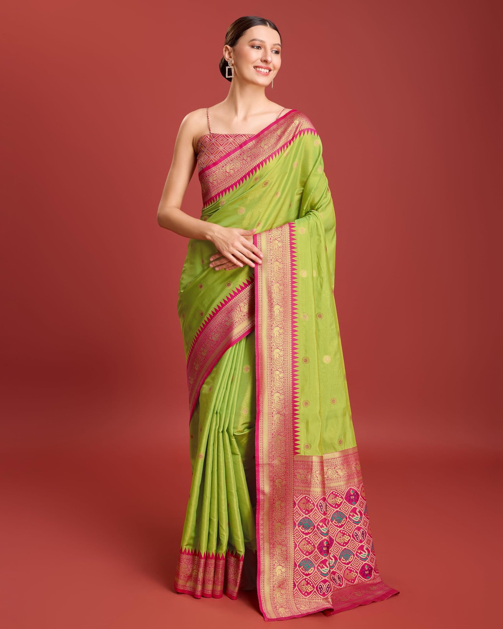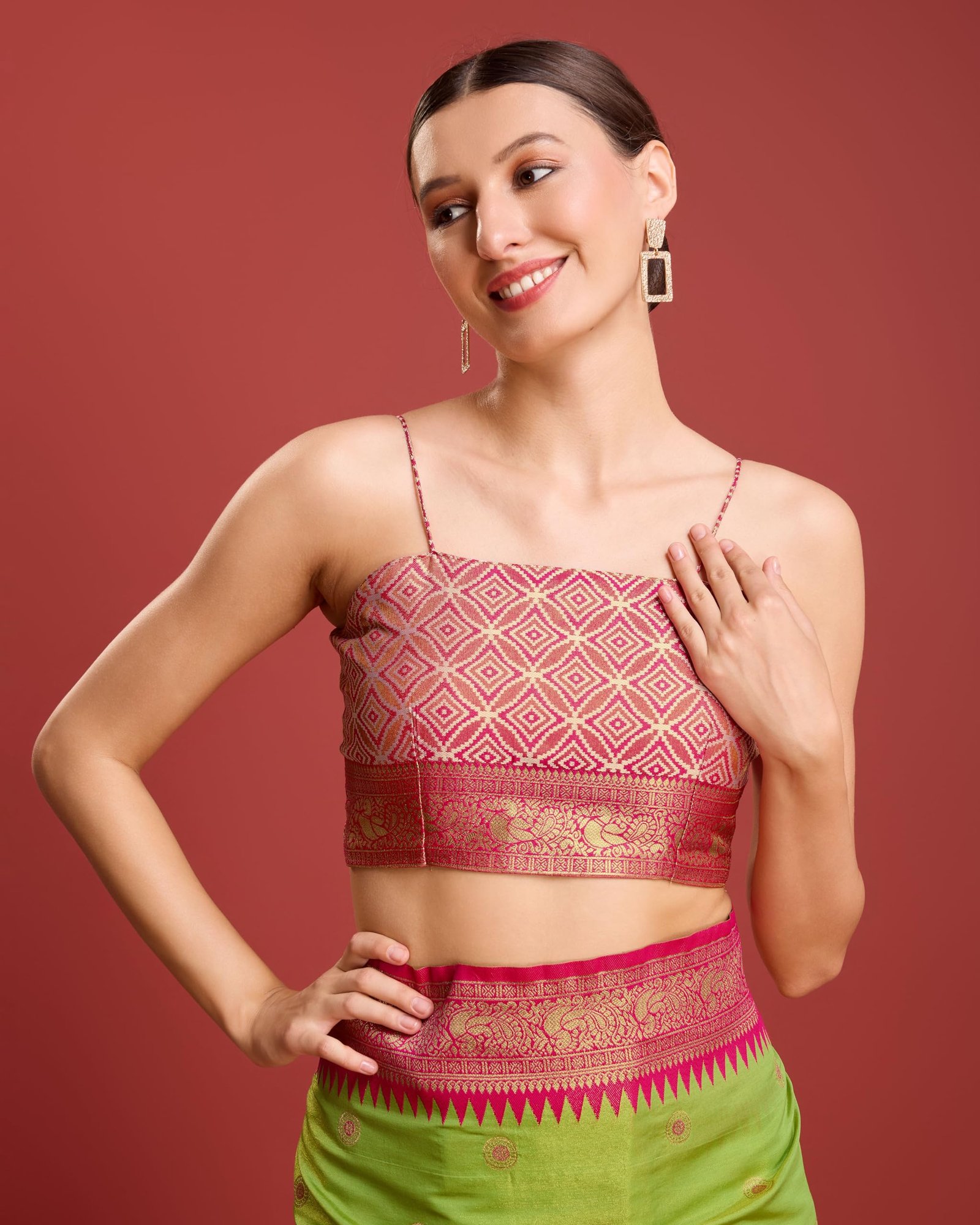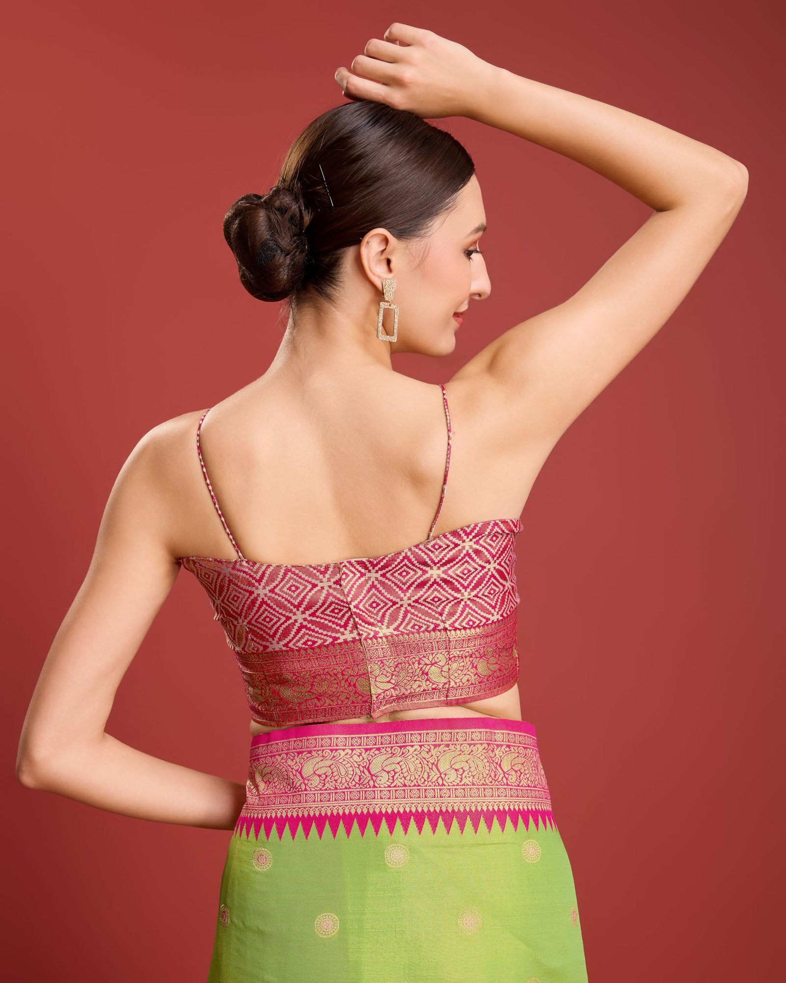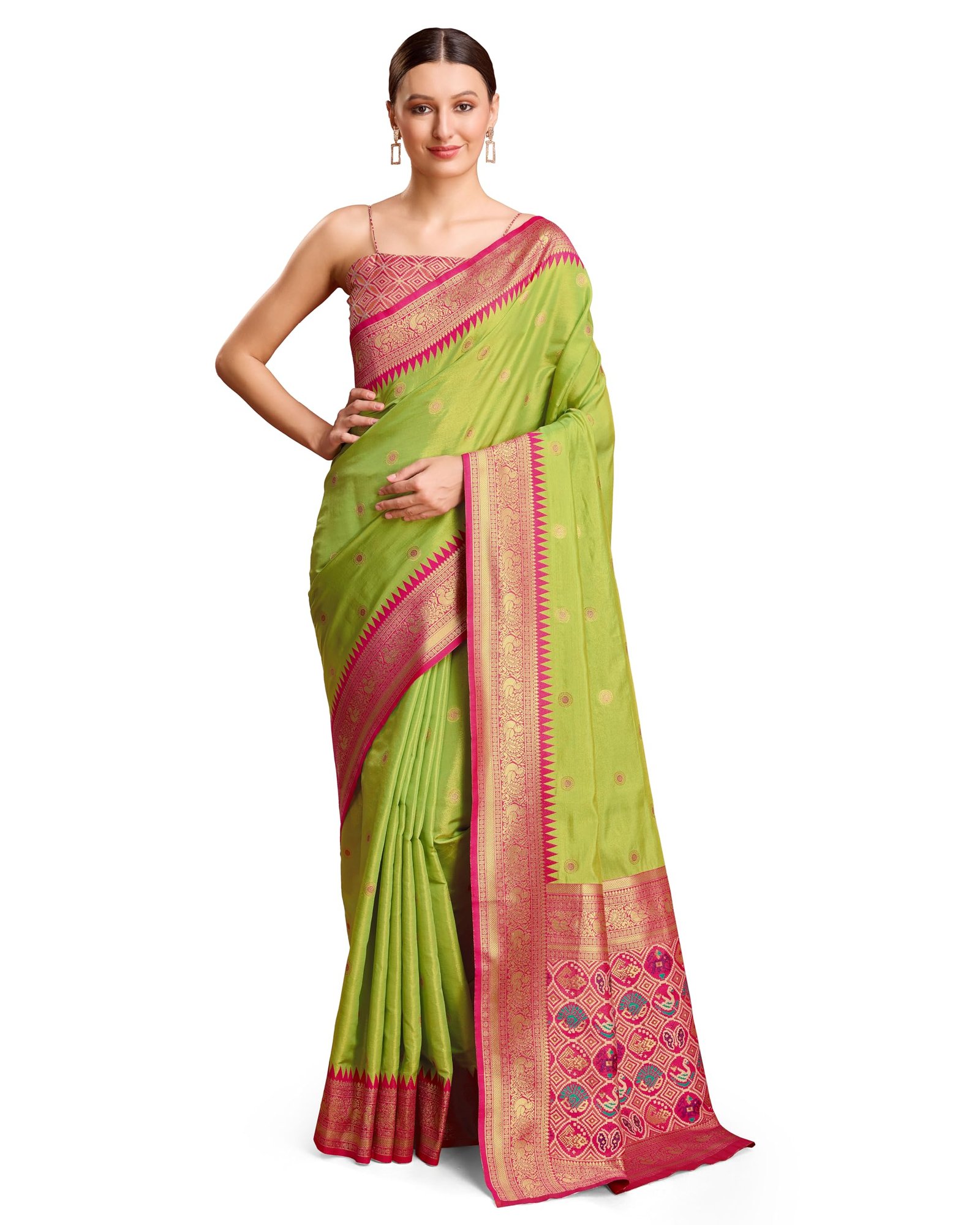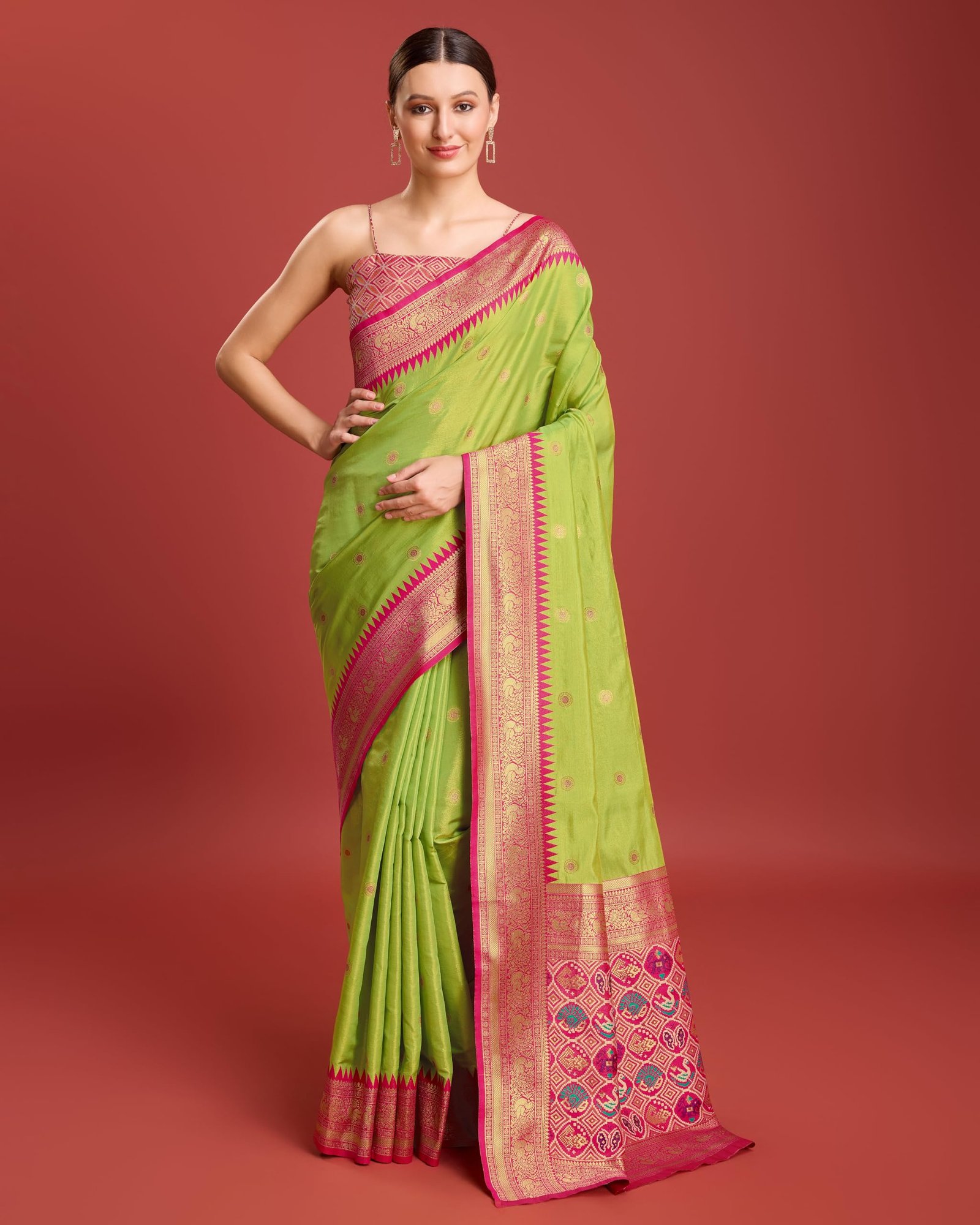 - Product Highlights : Fabric: Banarasi Tissue Silk (Saree & Blouse) || Work: Zari Weaving (Saree), Zari Woven (Blouse) || Colour: Saree –Parrot Green | Blouse –Pink|| A blend of silk woven with metallic threads, giving a gossamer, shimmery texture.