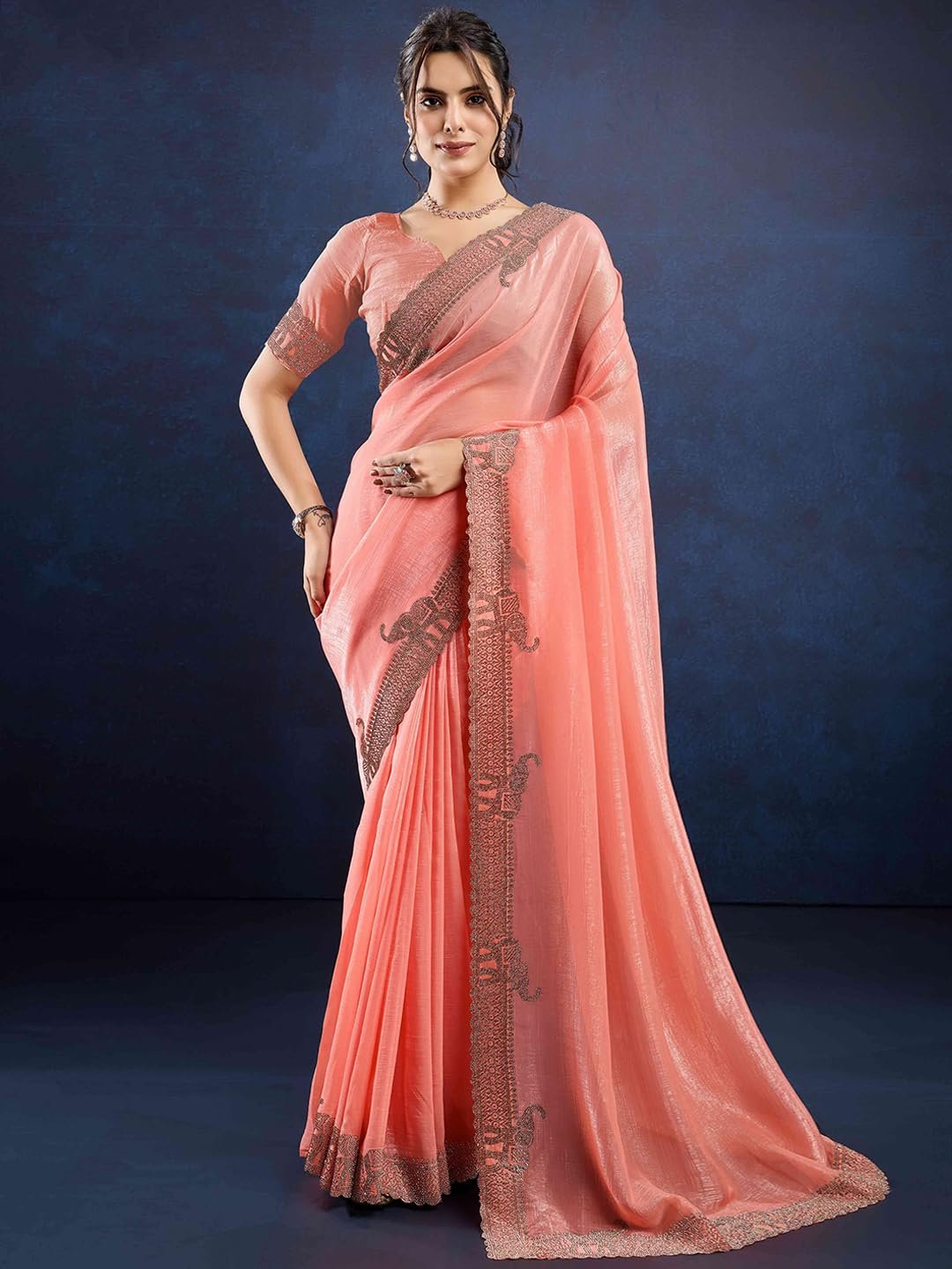 - Pattern & Details: Peach Embroidered saree with Beads & Stones, offering an elegant and stylish look.