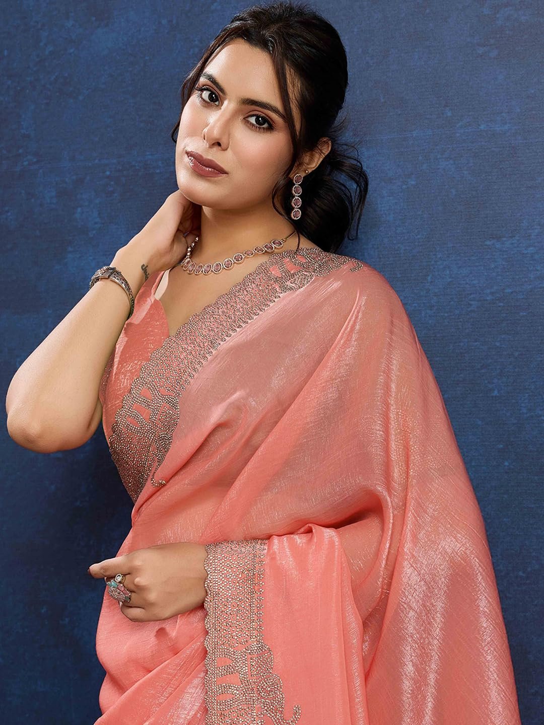 Peach Zarkan Diamond Work Crunchy Silk Fancy Fabric Saree|Saree with Unstitched Blouse Piece
