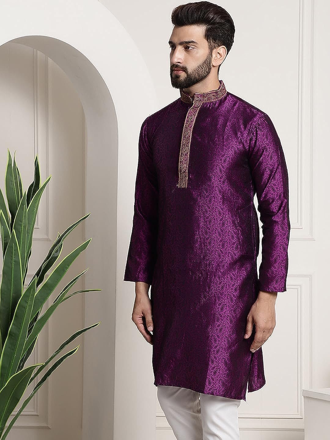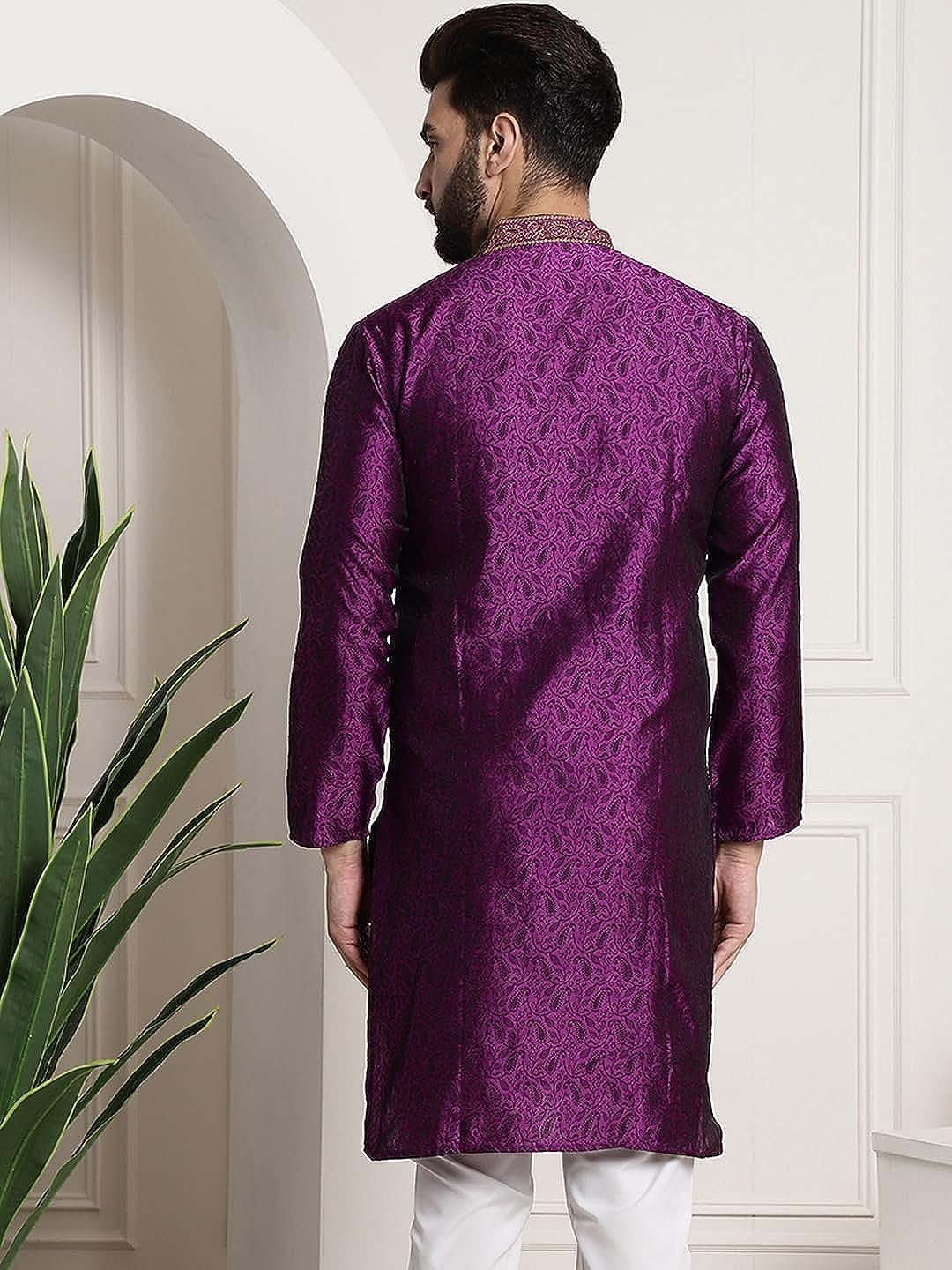 Royal Kurta Men's Silk Blend Black Color only Long Kurta with Neck Embroidery (40, Purple)