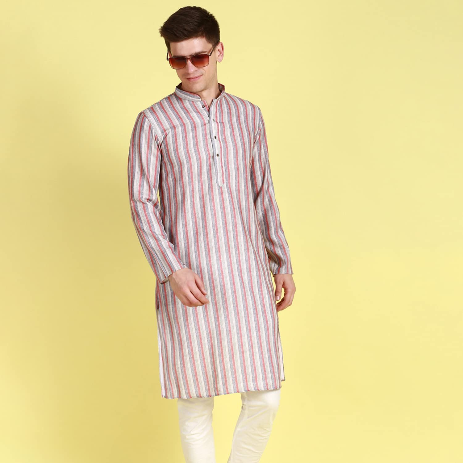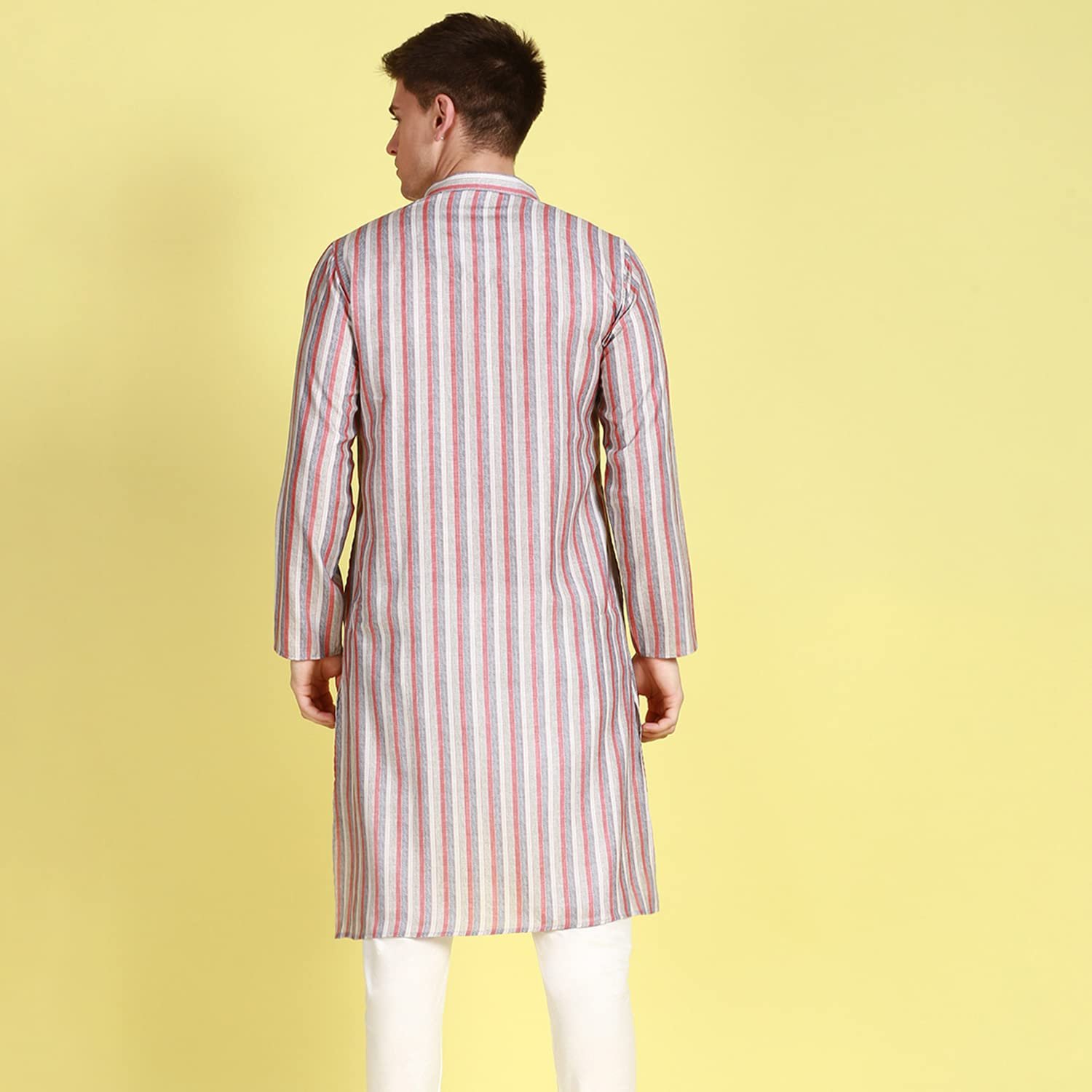 - Striped Multi Color Cotton Kurta for Men; Kurta Design : Mandarin Collar, Long Sleeves, Straight Hem,Side Slits with 2 Pocket.