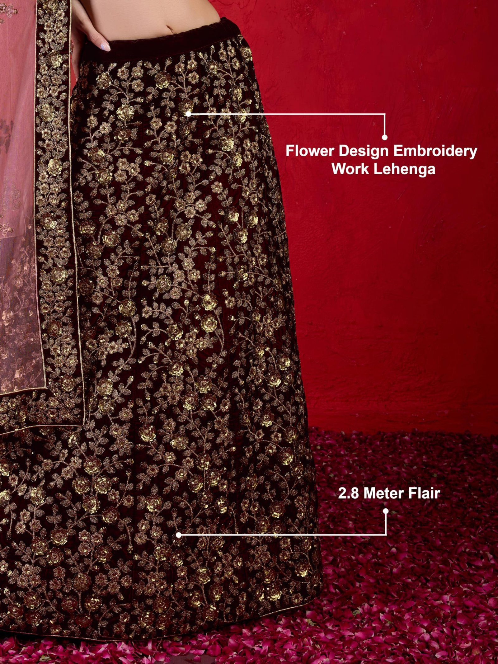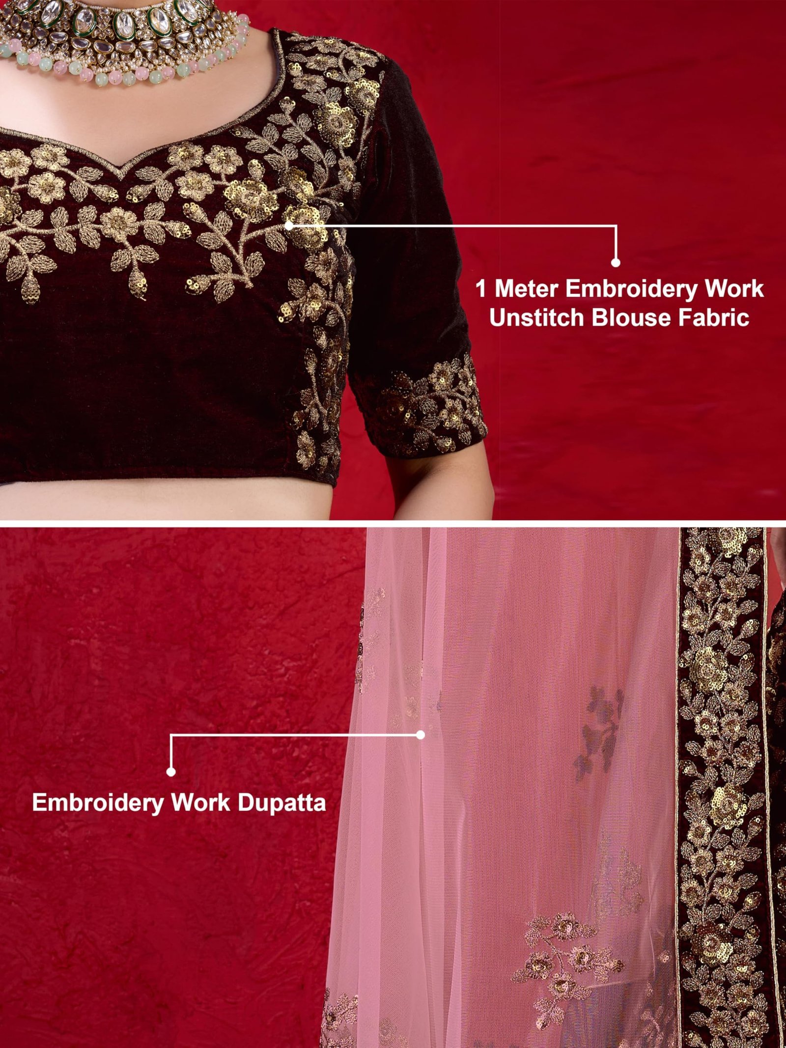 TRENDMALLS Women Velvet Semi Stitched Embroidery Lehenga Choli with Net Dupatta (L253-Maroon-Semi-Stitch), 1.10 Meter