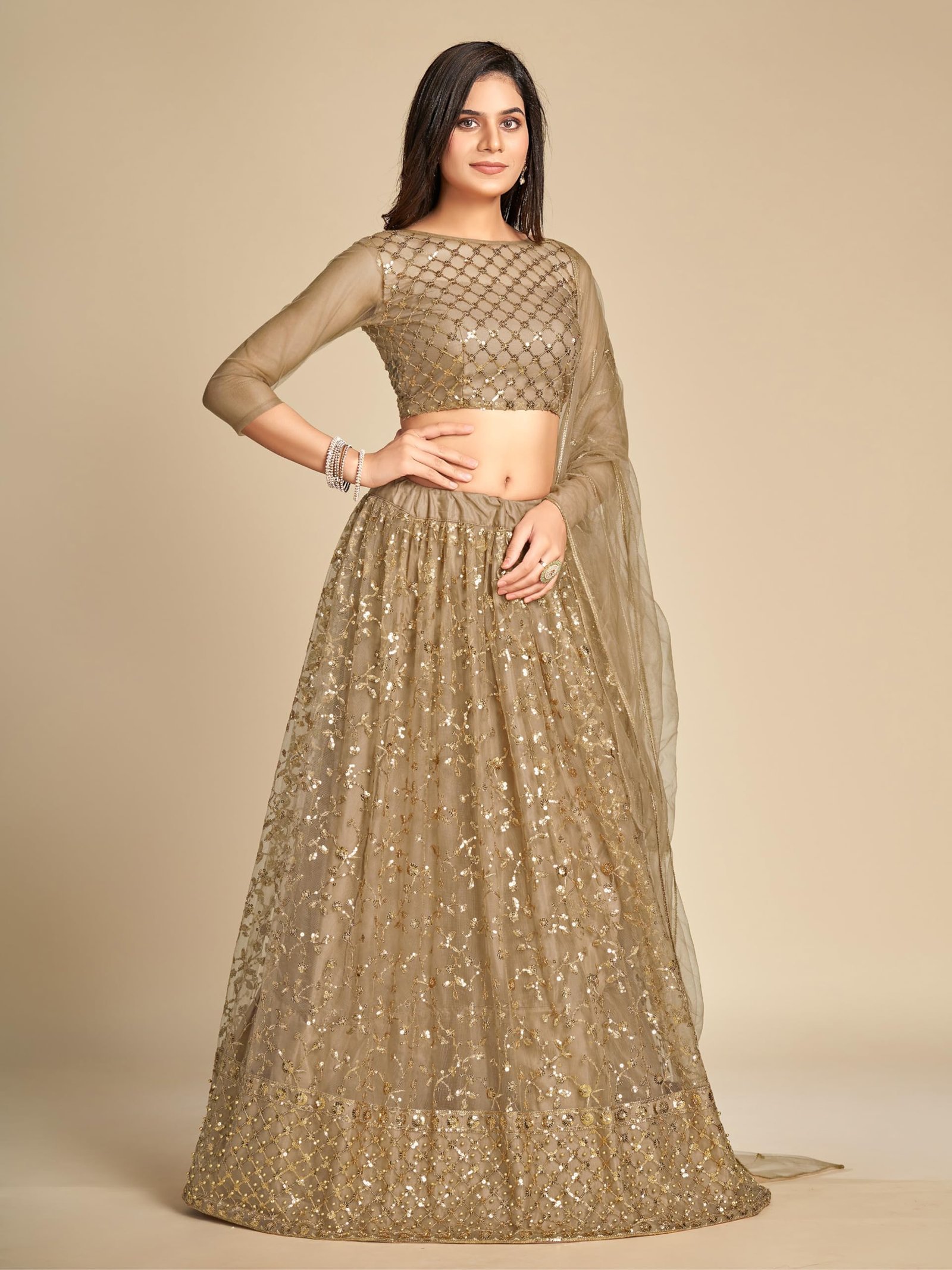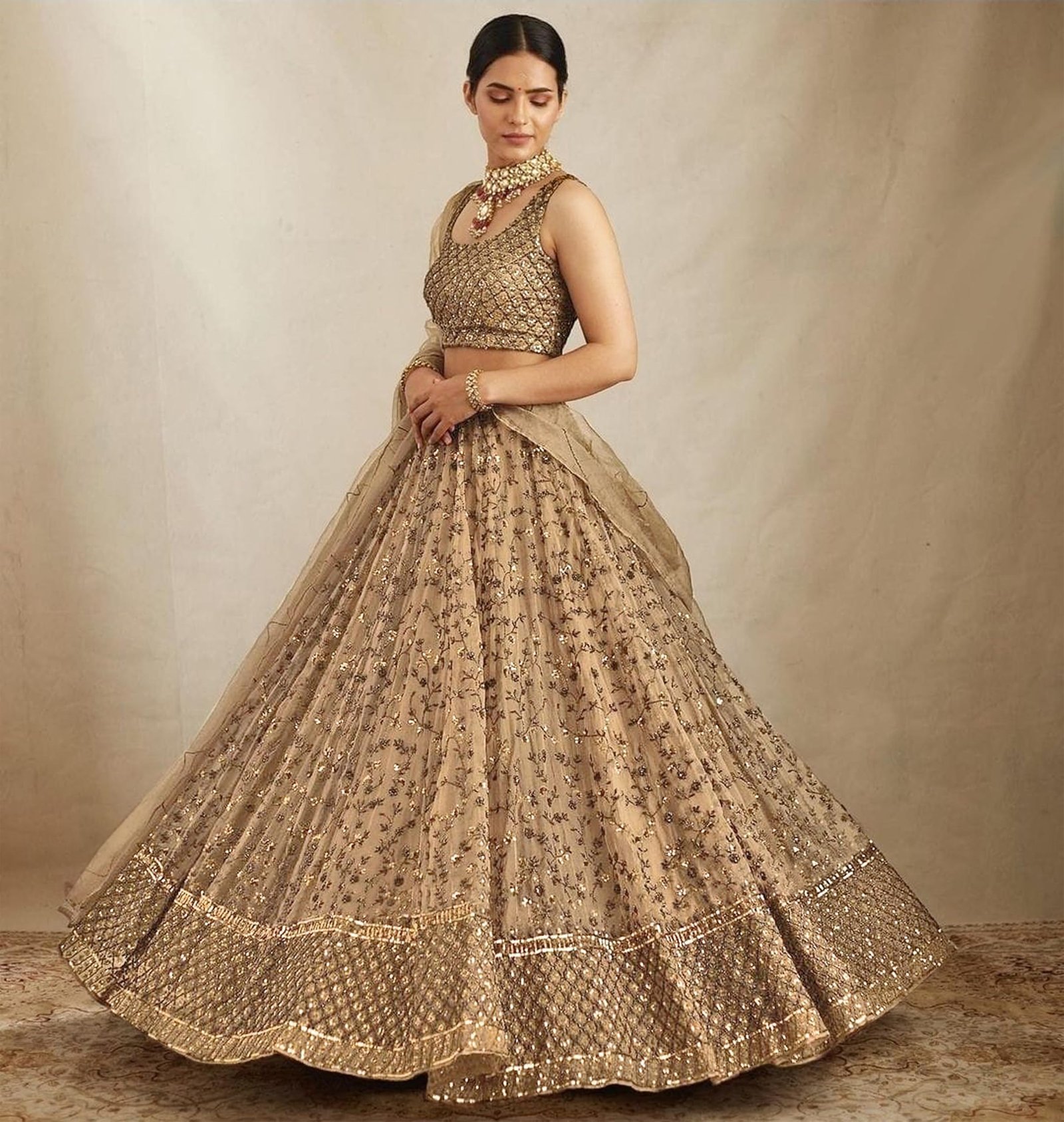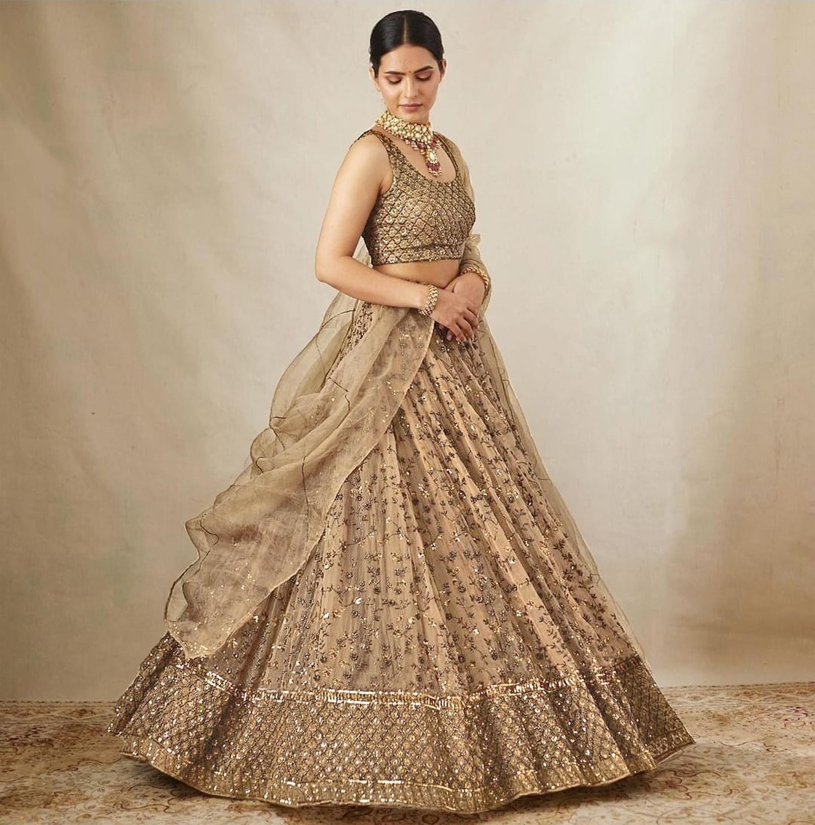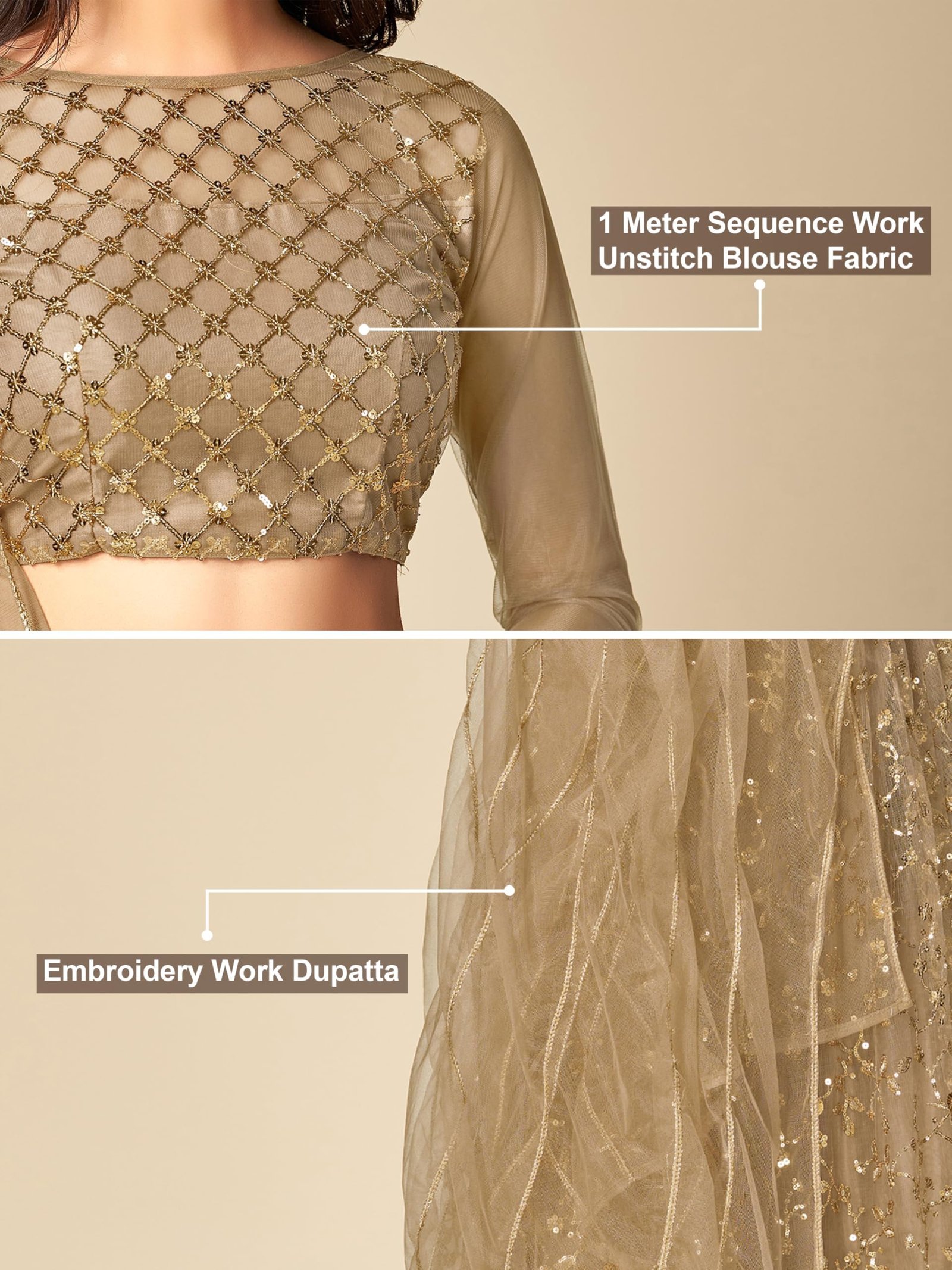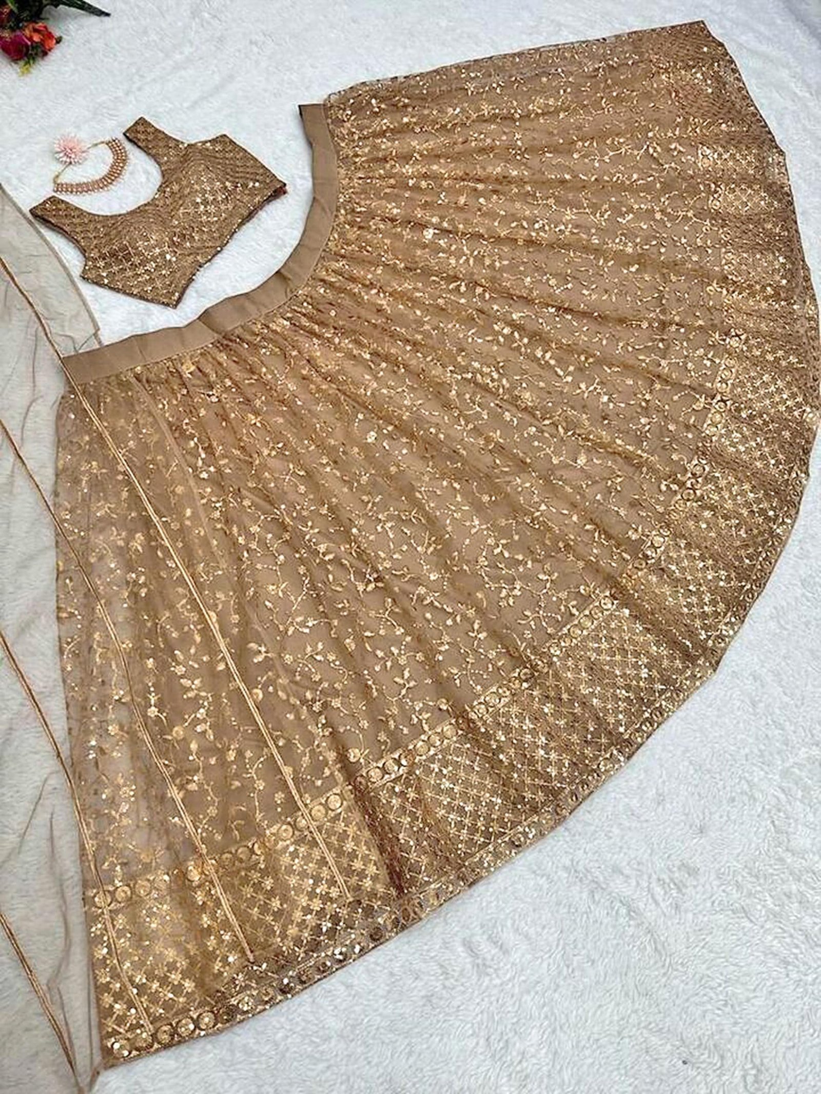 • Color: Lehenga: Gold; Choli: Gold; Dupatta: Gold